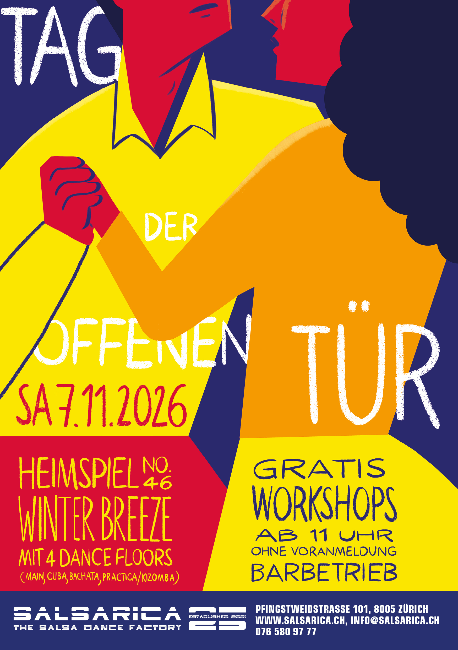 Wir öffnen unsere Tore wieder für alle Tanzinteressierte (und auch solche, die es noch werden könnten), die bei uns reinschnuppern, oder ganz einfach für alle, die einen Tag Tanz gratis und franko geniessen möchten. Angeboten werden diverse Workshops in diversen Stilen von unseren Lehrern. Freut euch auf Salsa Cubana, Rueda, Bachata, Kizomba, Ladies Style, Reggaeton und vieles mehr:)