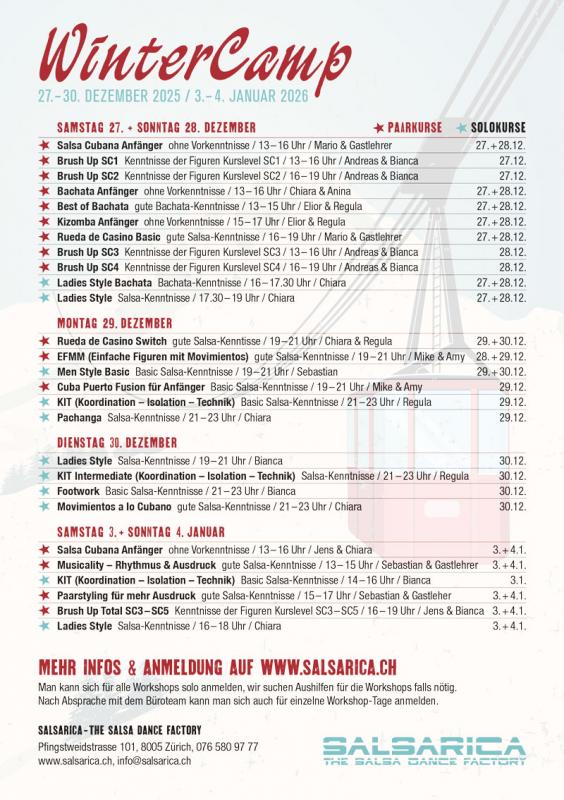 Diverse Paar- und Soloworkshops für alle im Bereich Salsa Cubana, Bachata und Kizomba warten auf euch. Auch zwei Salsa Cubana Einsteiger, ein Bachata Einsteiger und ein Kizomba Einsteiger Workshop sind am Start für euch.